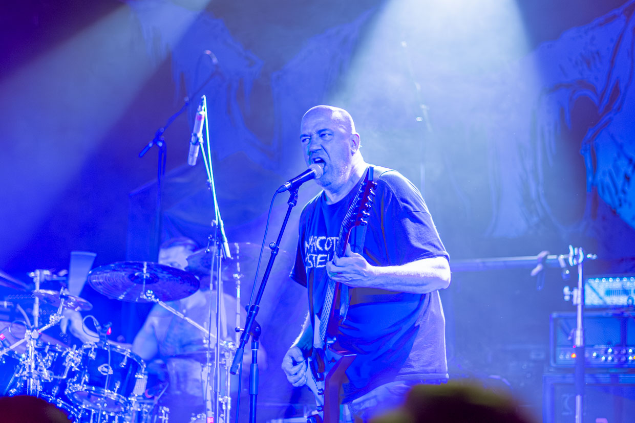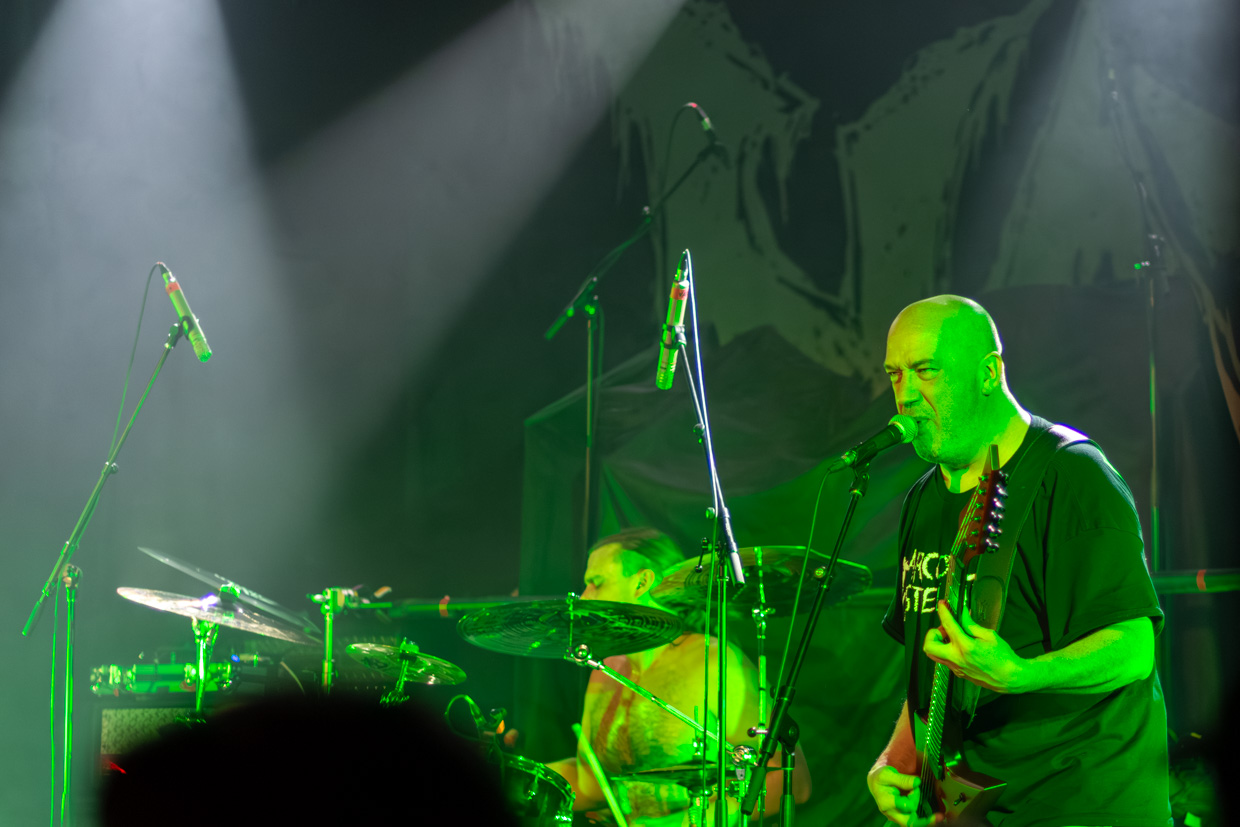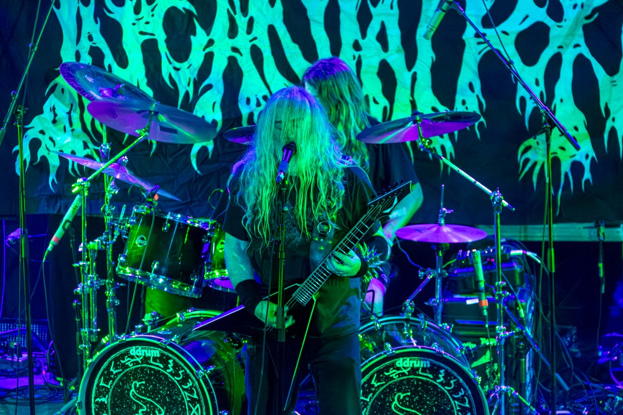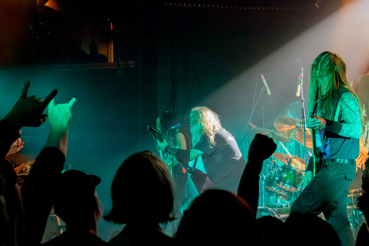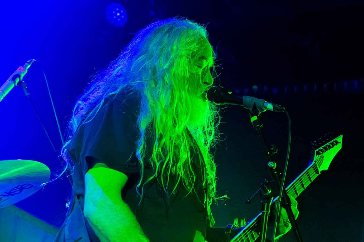 On retiendra particulièrement de cette aventure la voix gutturale de McEntee, encore plus grave et sombre que celles de ses prédécesseurs, qui frappe au cœur dès les premières notes, et le jeu ultra serré de chacun des musiciens qui bénéficiaient à ce stade de la soirée d’un son enfin régulé. La batterie incessante de Kyle Severn avait de quoi marquer les esprits, et ne passons pas sous silence la basse si profonde de Chuck Sherwood qu’un verre vide est tombé du bar en fond de salle sans que personne n’y touche et a éclaté, ce qui a fait dire aux quelques spectateurs ayant assisté à la scène que c’était peut-être une entité maléfique qui s’amusait à les effrayer plutôt que les vibrations intenses qui avaient causé le dégât.