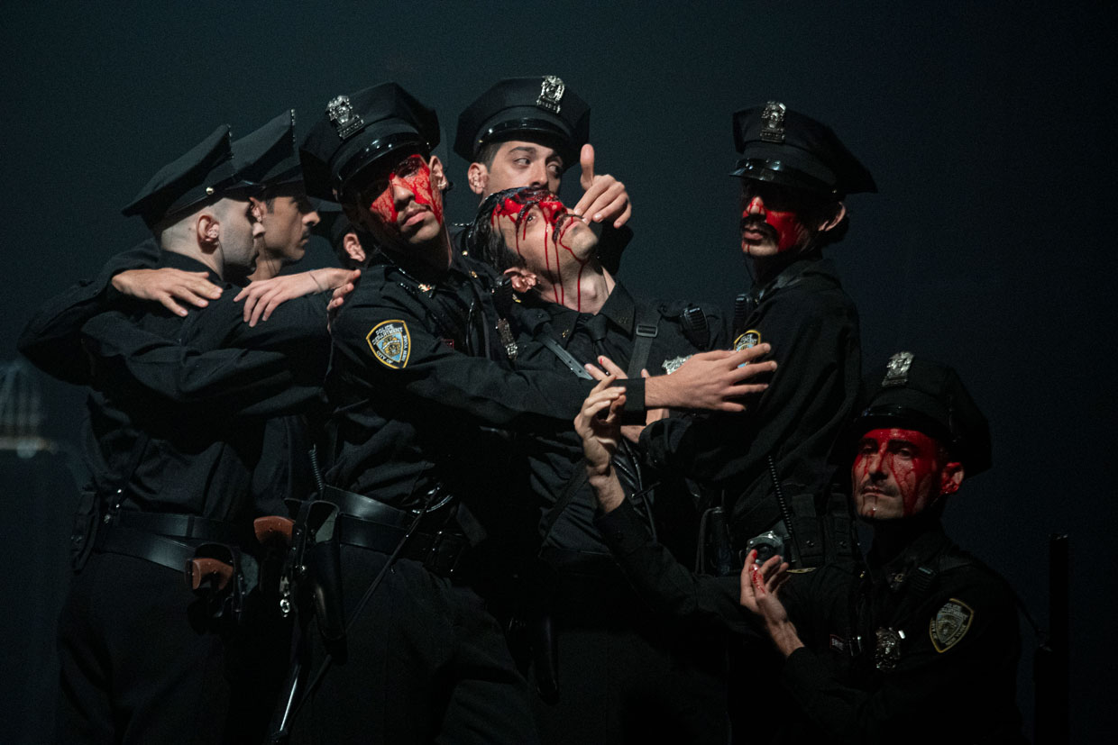 Le metteur en scène italien a même fait un Jean-Pierre Ronfard de lui-même avec une scène où les policiers fusillent le public à répétition avec des fusils à pétard. C’est particulièrement confrontant d’avoir 15 hommes, de glace, qui tirent sur la gâchette à répétition vers vous. À travers le bruit claquant des pétards, la fumée qui s’en dégage et cette impassibilité dans le visage de ces actants, on passe un moment de profond malaise.