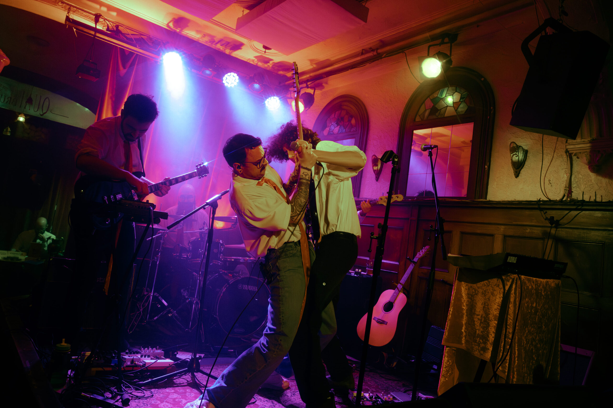 Puis, place au deuxième groupe : Couleur Dauphin. Ils sont montés sur scène, tous habillés de chemises blanches et de très longues cravates rouges, rappelant à la fois des collégiens et Trump. Ils étaient cinq sur scène : Thomas Chapais-Roy au chant, Emilio Hidalgo à la guitare électrique et à la flûte, David Caron-Proulx à la guitare, Daniel-André Bélanger à la basse et Jessy Normand à la batterie. Ils ont commencé très fort… trop fort. Le son était assourdissant, un véritable mur de distorsion et de batterie qui noyait complètement la voix et les mélodies.