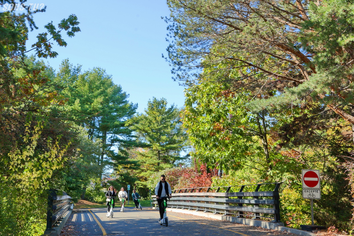 C’est le temps de lâcher vos écouteurs. Eh oui, pour une fois! Car on vous propose maintenant de tracer les sentiers du parc Jean-Drapeau en trottinette ou en Bixi, tous deux accessibles sur le site pour la location. Si vous vous sentez rebelles, vous pouvez garder vos écouteurs et ne pas suivre nos indications, mais votre portefeuille n’aimera peut-être pas le résultat. À vos risques et périls!
