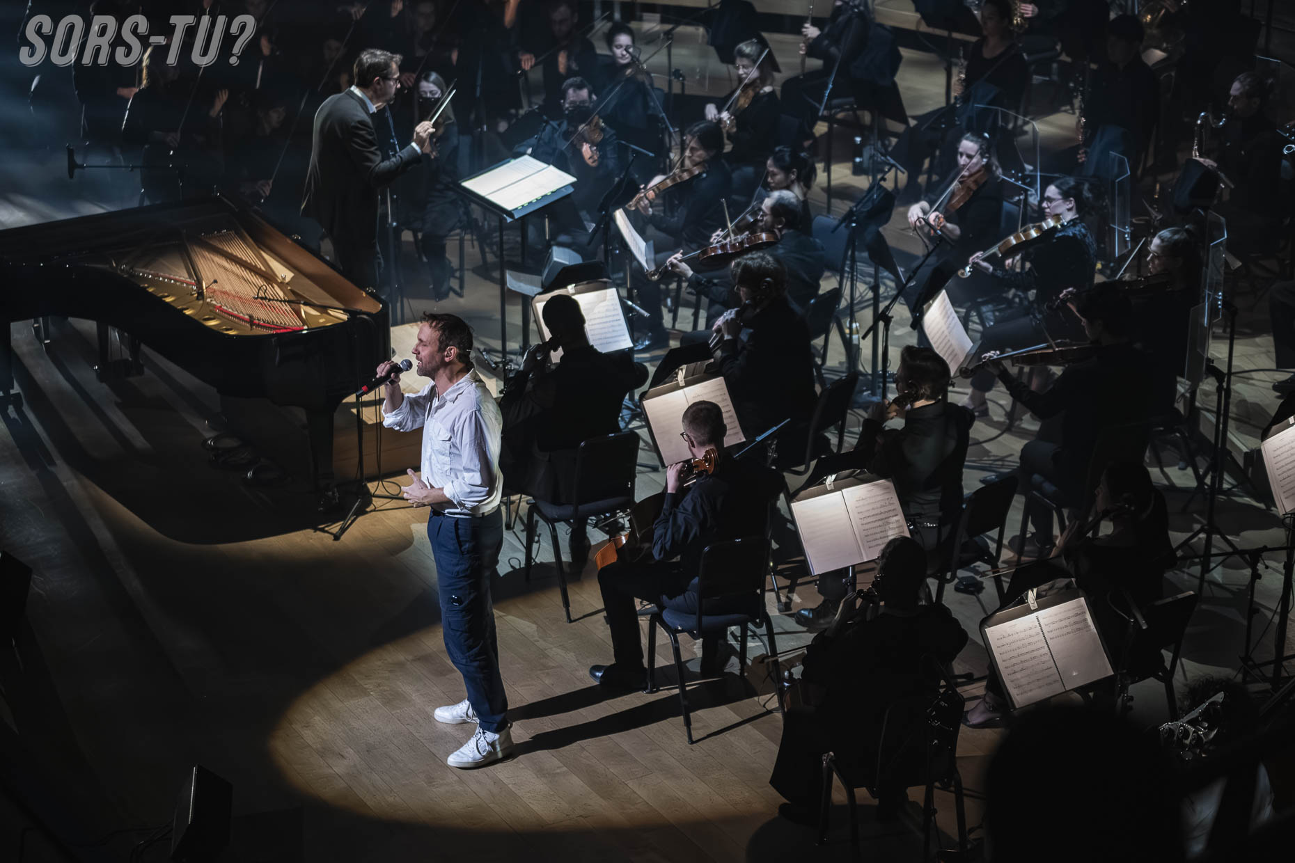 C’est devant un public conquis d’avance que l’auteur-compositeur-interprète (également acteur, metteur en scène, alouette!) s’est lancé avec la très belle Besoin de bras, annoncée par quelques notes de piano toutes en délicatesse, prémisse d’un tour de chant fort en contrastes. Porté par les arrangements pour orchestre (Guido Del Fabbro et François Vallières), savamment exécuté par l’Orchestre de l’Agora, Émile Proulx-Cloutier a enchaîné ses chansons réfléchies, en ponctuant le tour de temps d’habiles échanges vers le public, rappelant le talent de conteur d’un Michel Rivard des années de Bonsoir, mon nom est….