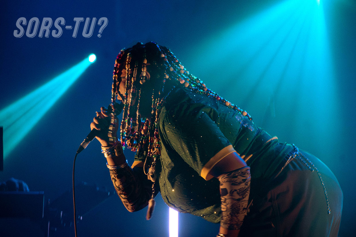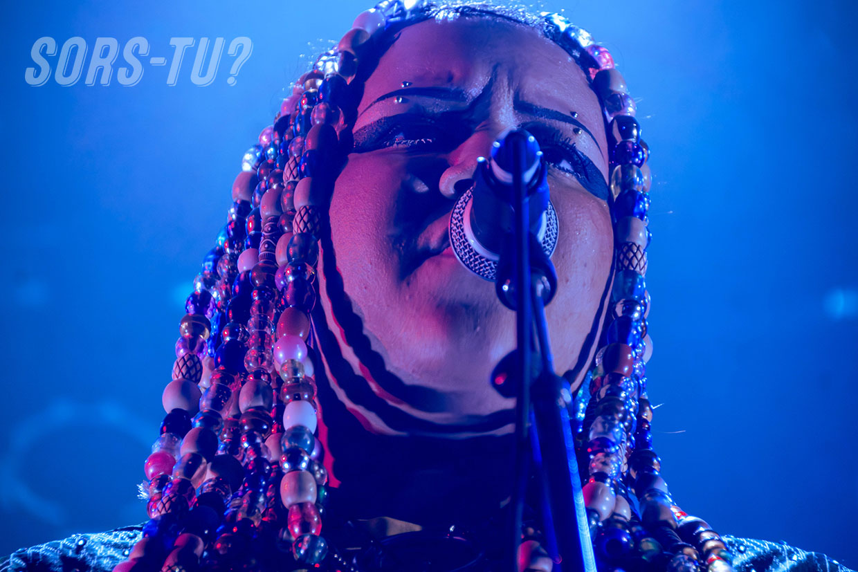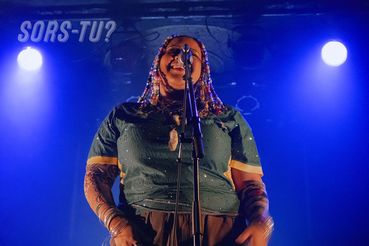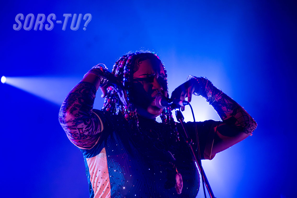 Quelques notes de sa voix douce et envoûtante ont suffi pour entrer dans son univers. L’artiste fait preuve d’une solide maîtrise vocale, qu’elle choisit de moduler avec liberté, intégrant de l’Autotune sur des textes engagés. Débordante d’assurance, Fyore use de la scène comme d’un terrain de jeu. Elle danse, s’amuse, nous prend en photo avec sa DS Lite recouverte de strass.