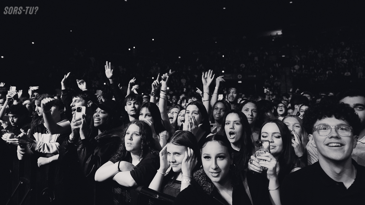 Vers 20h40, quelques secondes avant le début du spectacle, l’écran géant derrière la scène diffuse des images de feux de forêt, de cyclones, d’émeutes… Je vous avais dit que Josman était cynique? Les téléphones ne tardent pas à se lever, et les ardeurs du public reprennent de plus belle en entendant le simple « Easy Dew, pétasse », trademark de l’univers de Josman depuis ses débuts. D’ailleurs, le public, parlons-en : avec des spectateurs d’une moyenne d’âge s’approchant des 15-16 ans, on se doute que tous les secondaires de Montréal vibreront au même diapason lundi prochain, quand les élèves se partageront entre eux, dans les couloirs, leurs plus beaux souvenirs de la soirée, peut-être un premier concert pour beaucoup. Il est quand même étonnant que ce soit un public si jeune ce soir dans la salle, alors que Josman a commencé à se faire connaître au milieu des années 2010, mais bon.
