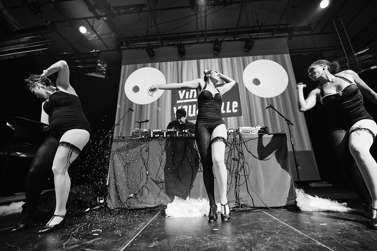 Eh oui, dans son infinie générosité, il a en effet donné un bref mais énergique concert de Vinyl Vaudeville, dans un décor vintage, débordant de néons et vieilles télés cathodiques. On eut droit à un set classique, qui ressemblait pas mal à celui qui ouvrait le show de Deltron 3030, mais avec en plus le trio de danseuses burlesques à plumes qui l’accompagne habituellement lors de ses shows VV.