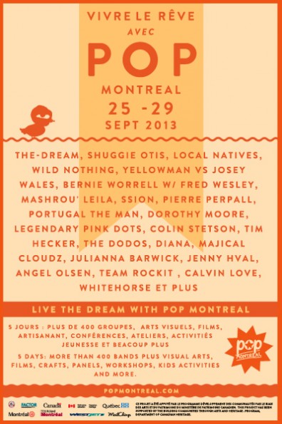 Le festival Pop Montréal vient d’annoncer une première vague d’artistes pour son édition 2013. L’événement, qui aura lieu du 25 au 29 septembre 2013, accueillera entre-autres le chanteur R&B américain The-Dream, le groupe rock expérimental californien The Dodos ainsi que le groupe indie rock de Los Angeles Local Natives.