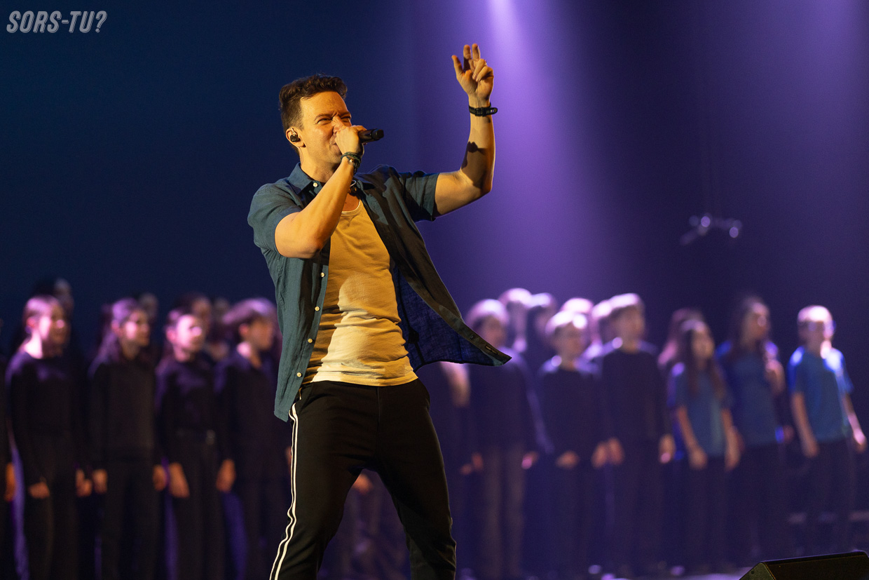 Puis, dans un noir maîtrisé, QW4RTZ apparaît. Quatre silhouettes… puis davantage. Rapidement, la scène se remplit : cinq, quinze, jusqu’à une soixantaine de jeunes choristes qui viennent ouvrir ce dernier chapitre. Un geste fort. Ces artistes, eux-mêmes issus des Petits Chanteurs de Trois-Rivières, choisissent de redonner au suivant en invitant Les Petits Chanteurs de Beauport et la Maîtrise des Petits Chanteurs de Québec. Une passation vivante, incarnée.