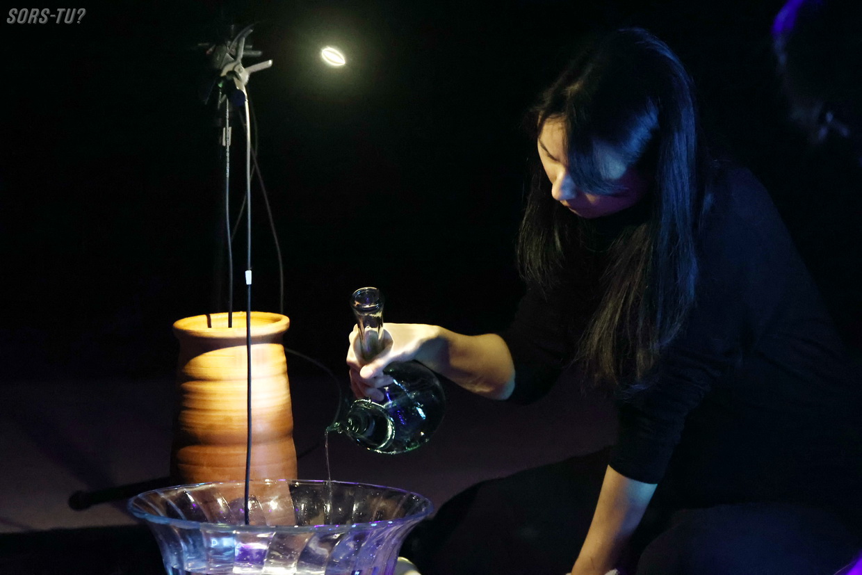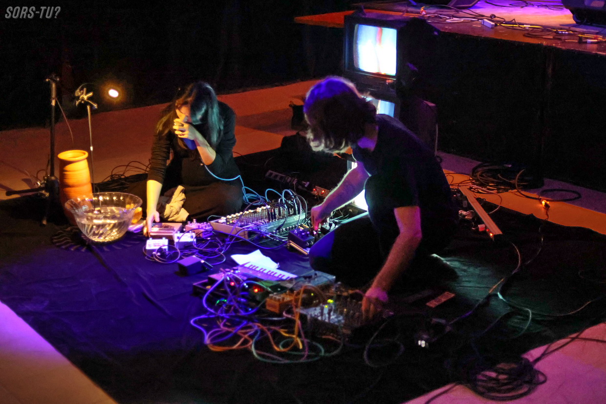 Ils se sont exécutés sous une lumière tamisée et devant de vieux téléviseurs sur lesquels on pouvait voir des vidéos abstraites synchronisées avec les textures audios. Pendant une trentaine de minutes, nous avons eu droit à une improvisation intégrant des bruits transformés et d’autres plus concrets comme de l’eau versée dans un récipient. La gestuelle lente, répétitive et méthodique nous guidait vers une transe calme.