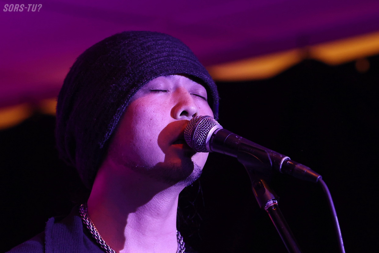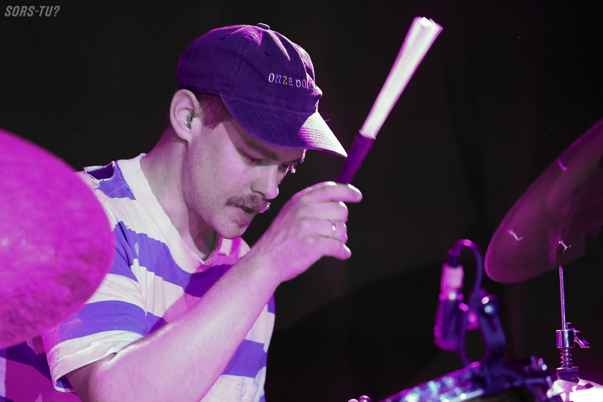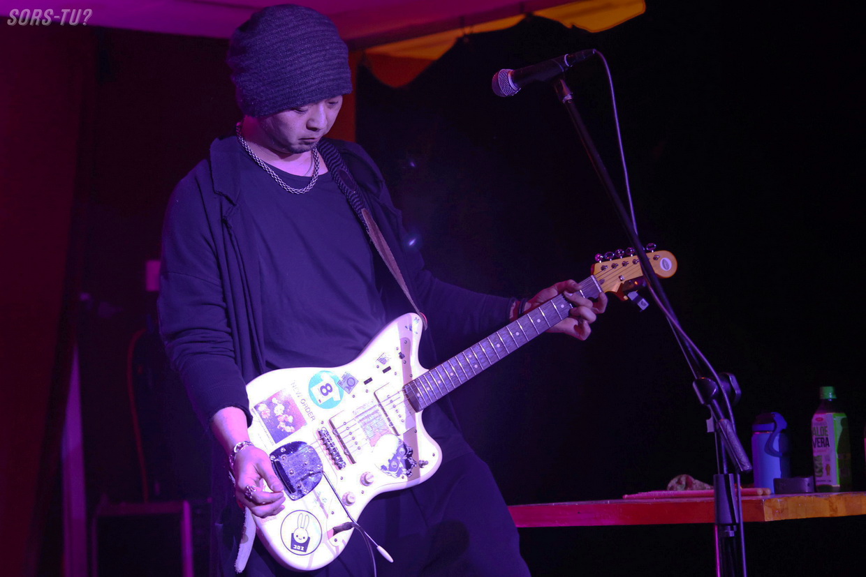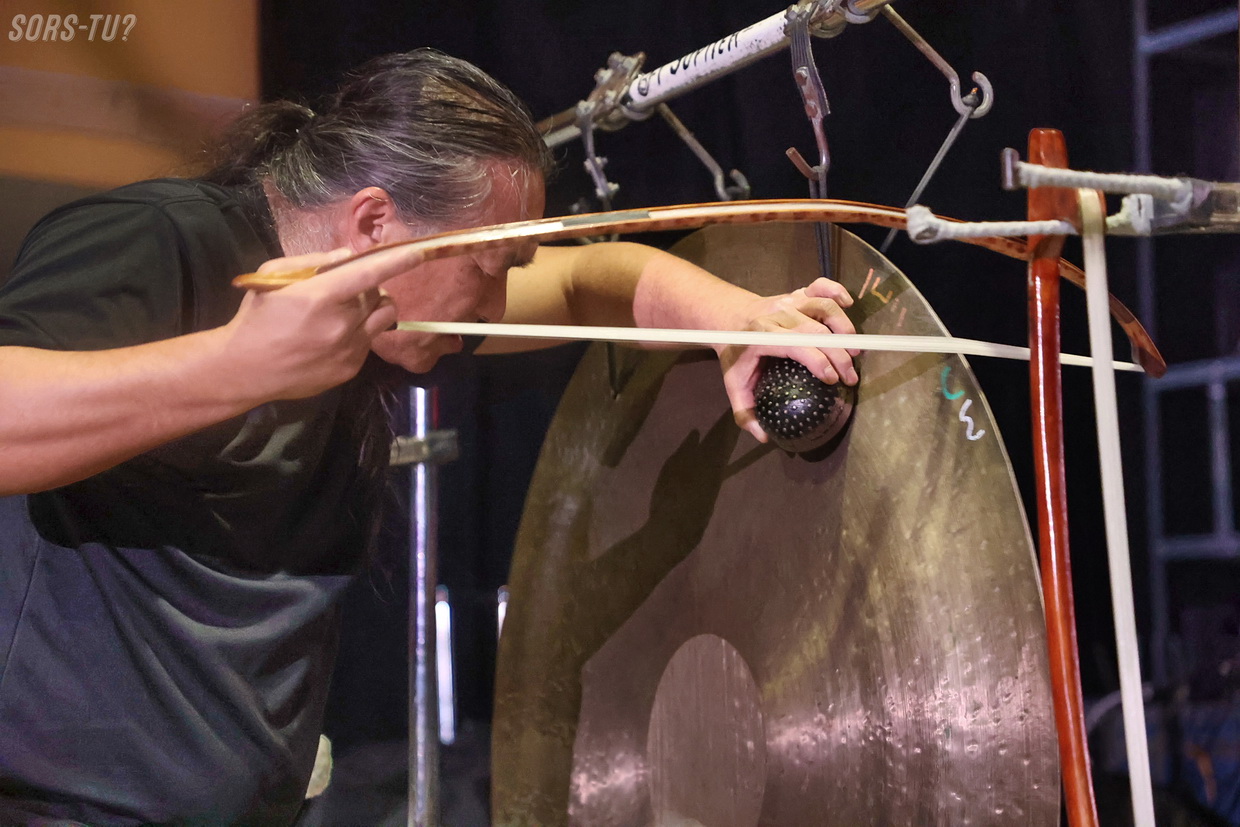 C’est en solo qu’il s’exécutait, donc il était entouré d’un large gong, de Kobo Bows (archets qu’il sculpte lui-même et qui produisent des textures impossibles à obtenir avec des archets traditionnels) et de divers objets percussifs incluant des cymbales, tambours et bols chantants.
