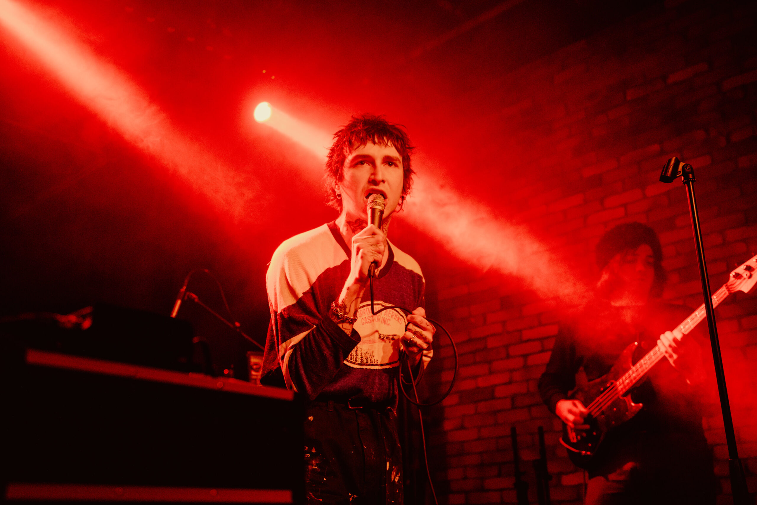Alix Fernz a lancé la soirée vers 20h avec des morceaux tirés de sa Symphonie publicitaire sous influence. Ayant débuté sa carrière très récemment (son premier projet long date de 2024), Fernz s’en tire bien sur scène, et se démarque par sa proposition plutôt originale : du post-punk à l’esthétique gothique, ça ne coure pas les rues non plus au Québec.