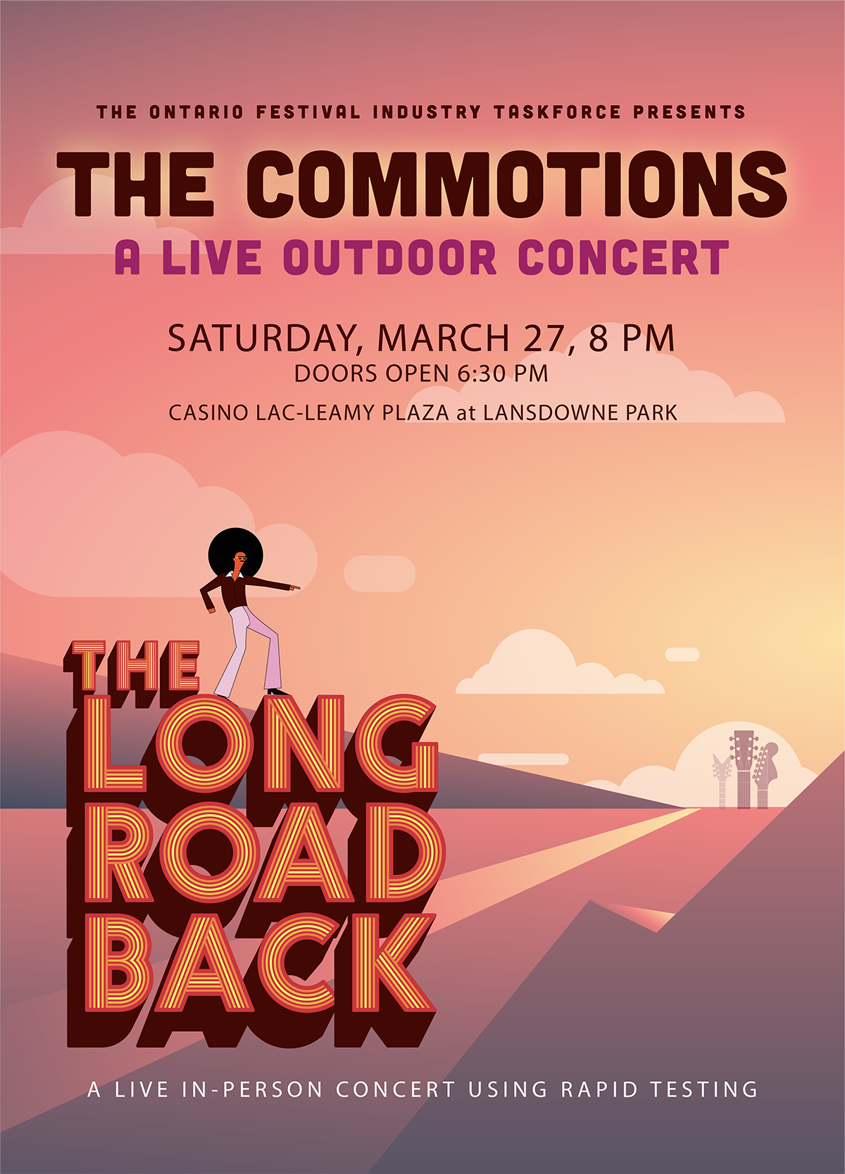 Un concert intitulé « The Long Road Back » se tiendra en présentiel le 27 mars 2021 au Lansdowne Park, à Ottawa, avec le groupe Motown, The Commotions. Cette expérience inédite au Canada servira de test afin d’évaluer la possibilité de rouvrir les portes de la musique live en toute sécurité grâce à un procédé de testage rapide de la COVID-19, un premier du genre au Canada.