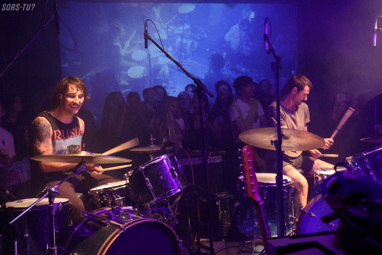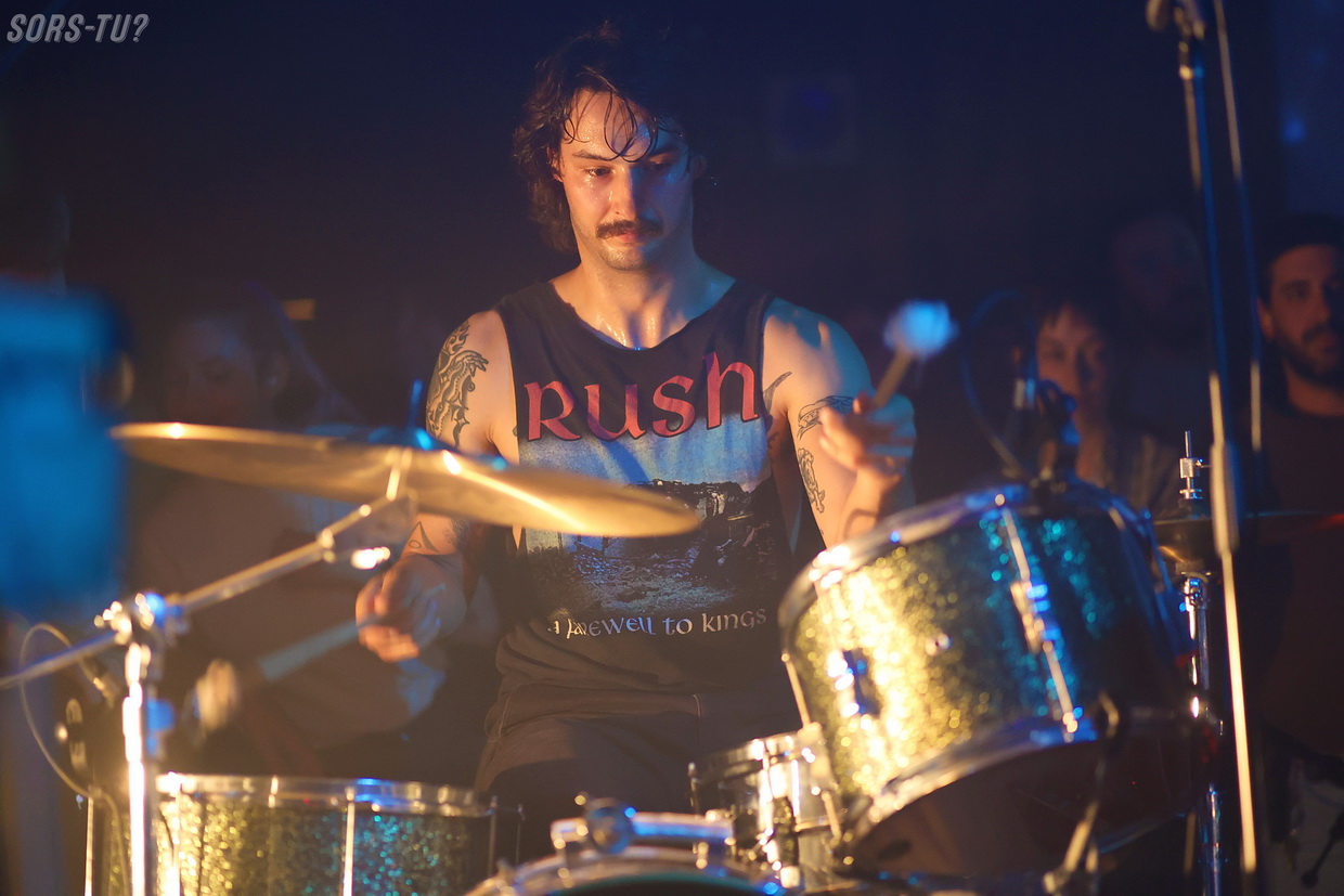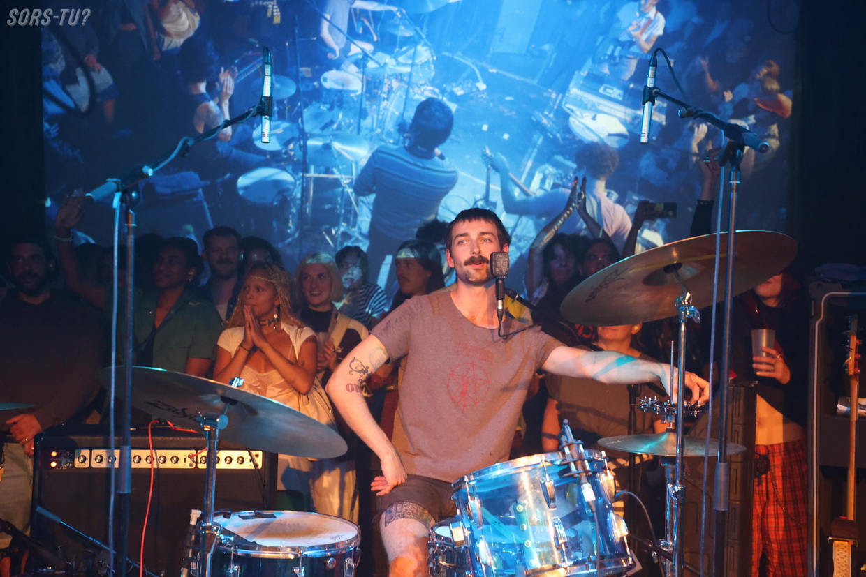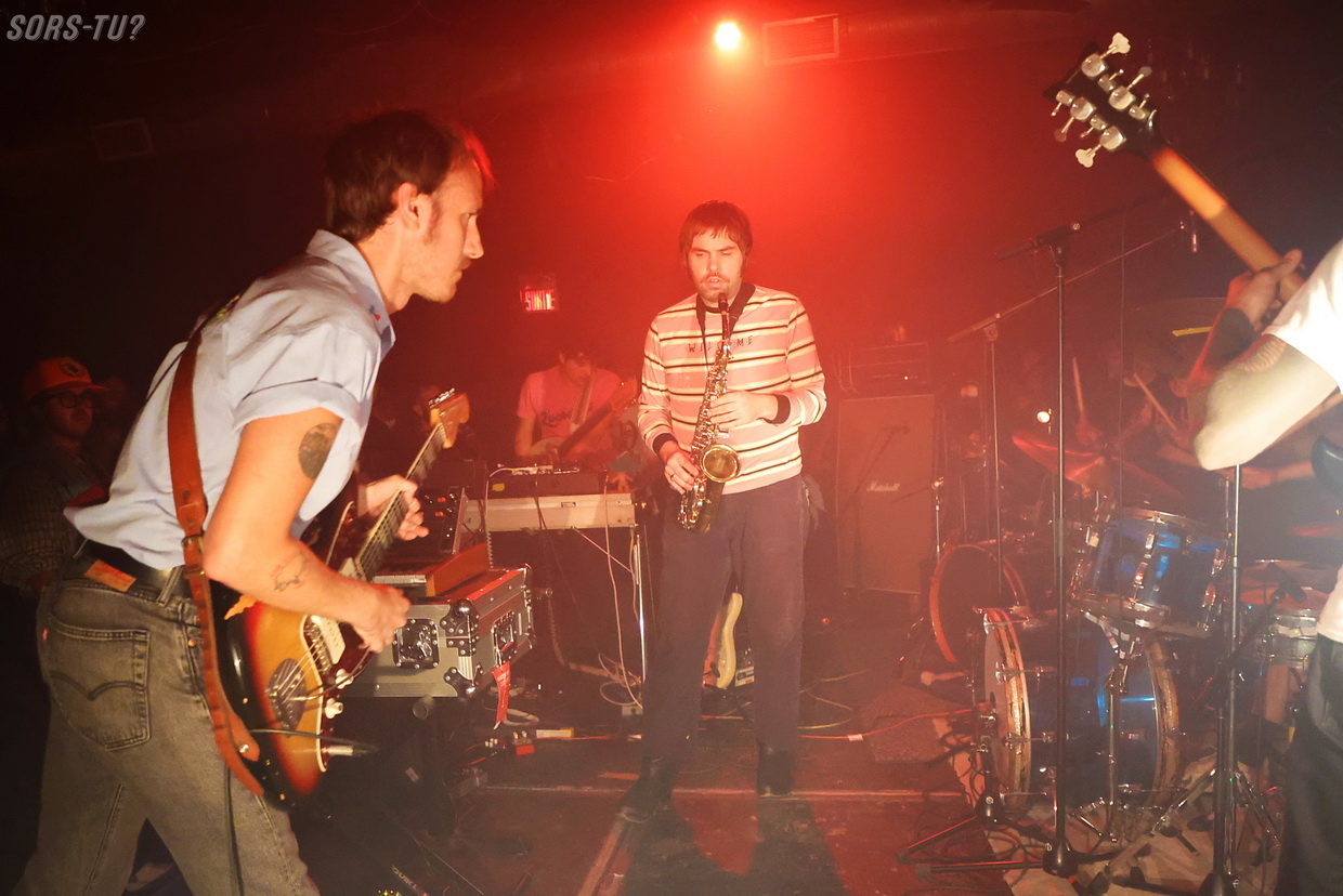 La salle est rapidement très remplie et la formation a installé une scène centrale, et le public peut circuler en arrière comme l’avait fait Misc lors du lancement de Beat Bouquet aux Foufs, il y a quelques semaines. On retrouve les deux batteries de John Talbot (YDR) et Pierre-Luc Gratton (Pop II), également au chant. Sébastien Provençal (Pop II) est à la basse 8 cordes principalement. À l’avant scène, on retrouve Tristan Lacombe (Pop II) à la guitare électrique 12 cordes et au clavier, Justin Cober (YDR) à la guitare et au clavier ainsi que Nolan Potter en maître de cérémonie, joueur de guitare, flûte et saxophone.